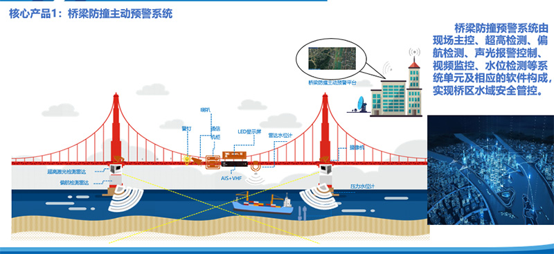 包括智慧港口、航道施工集成、散料輸送自動控制系統、橋梁防撞主動預警系統、智慧船舶管理系統和智慧視頻管理系統。